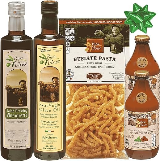 - Include Crackling Paper & Bow to Pleasantly Uncover 5 Delightful Items: 1 Extra Virgin Olive Oil 16.91 fl oz | 1 Ancient Grain Durum Pasta Busiate 1.1 lb | 2 Tomato Sauce 11.64 fl oz | 1 Salad Dressing 16.9 fl oz