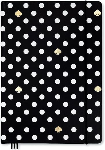 This vegan leather notebook journal is stylish and practical. It has a durable hardcover with a bold polka dot design and gold spade accents. With thick lined pages to prevent ink bleed-through, you can write, erase, and highlight as you please. It also includes a built-in bookmark and an elastic band closure for easy organization and secure travel. Compact and lightweight, it fits in most purses and bags for on-the-go use. This Kate Spade New York journal is perfect for jotting down goals, dreams, and desires.