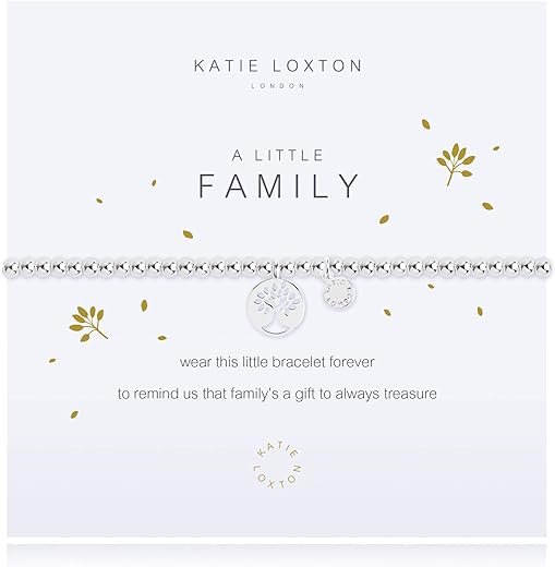 This beautiful bracelet by Katie Loxton is the perfect accessory for any casual outfit. It features a charming hardboard card with the title “Family” and a sentimental message about treasuring family. Made of silver plated material, it is gentle on the skin and has a subtle and lovely charm. The bangle style bracelet has an adjustable elastic band for comfort and is suitable for most sizes. It comes with an official Katie Loxton gift bag, complete with a satin ribbon bow.