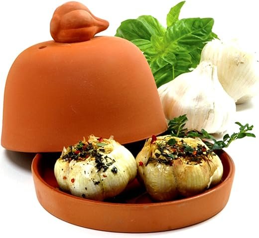 - Crafted from sturdy, natural terra Cotta and features an attractive garlic-shaped handle for easy gripping.