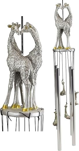 - This Silver Safari Giraffe Couple wind chime is made of designer composite resin, hand painted and polished. The rods are aluminum. Color Tone may vary slightly from pictures. Decorate your patio and garden with our exclusive wind chimes. Our wind chimes are not only artistically beautiful as a decor but they also provide calm and relaxation as the rods chime when the breeze comes through.