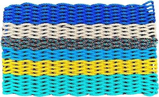 Each One of a Kind is a collection of Lobster Rope Doormats from The New England Trading Company. These mats are handwoven in Maine using recycled and scrap fishing rope, making them extremely durable and weather-resistant. They come in a gorgeous splash of colors that will brighten up any doorstep. Each mat is unique and reflects the colors shown in the images provided. They are fully reversible and suitable for non-skid surfaces. The mats also make excellent nautical gifts and come with a heavy stock 4-color card that describes their unique qualities.