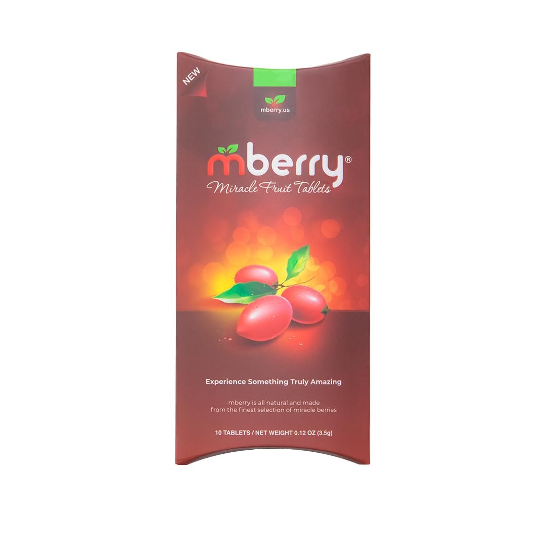 The mberry Miracle Fruit Tablets are a game-changer for your taste buds. These tablets, featured on major news outlets, give your tongue superpowers by changing the way you perceive flavors. Host flavor tripping parties or enhance your healthy lifestyle with these natural tablets. Each pack contains 10 tablets filled with 3 servings of Miracle Berry Powder for a longer and more intense experience. Take them on the go and bring the magic wherever you are. Upgrade your taste adventures with mberry!