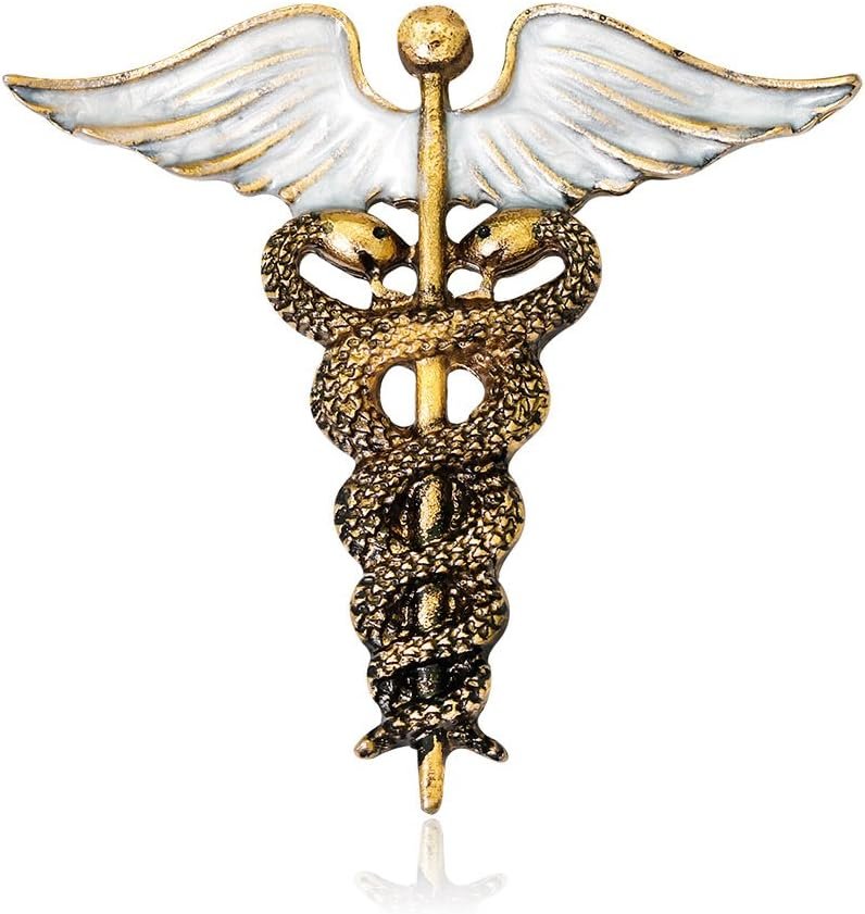 This brooch is made of alloy and measures 3.8*4.0cm/1.5*1.6In. It weighs 9g. The design features the caduceus and the rod of Asclepius, which are symbols of medicine, health, and peace. These brooches are nickel and lead-free, making them safe for people with allergies. They come with a gift package, making them a perfect gift for various occasions. The quality is carefully checked before packaging, and customer satisfaction is a priority. Please note that we do not manufacture or provide product services such as warranty or return.