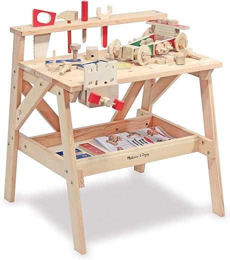 • SOLID WOOD WORKBENCH FOR KIDS: The Melissa & Doug Wooden Project Solid Wood Workbench, a realistic toy construction set for kids, includes a functioning vise, tool rack, wooden tools, and hardware, as well as project ideas to spark imaginations.
