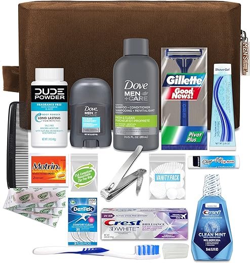 - TRAVEL SIZE TOILETRIES: A great gift set for men, this travel kit includes popular national brand grooming and oral care travel size essentials from brands including Barbasol, Gillette Good News, Dove for Men, Gold Bond, Crest, Colgate, Advil and Curad