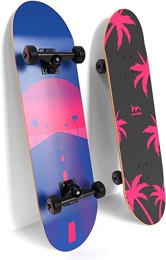 【No assembly required】This skateboard is ready to ride straight out of the box, and it comes with a tool to adjust the truck’s tightness.【Smooth ride】Equipped with ABEC-8 bearings, the wheels rotate smoothly and steadily, ensuring an easy and enjoyable skateboarding experience without sudden deceleration or wheel stoppage.【Turns easier】The lightweight trucks and flexible PU bushings allow for easy steering and comfortable turns without any squeaking. It also helps beginners to quickly correct their skating direction.【180 lbs. load capacity】With its 8-layer maple deck, this skateboard is sturdy and resilient. It can handle the weight of riders without breaking or delaminating.【Easier to play tricks】Featuring a grip tape, double kick, concave deck, and durable PU wheels, this skateboard is suitable for all skill levels. It allows you to perform tricks and land smoothly.