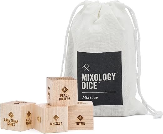 - Eight laser engraved birch wood dice (spirit, sugar, liqueur, citrus, fruit, herb, spice, and bitters) that provide inspiration for creating hand-crafted cocktails made with fresh ingredients