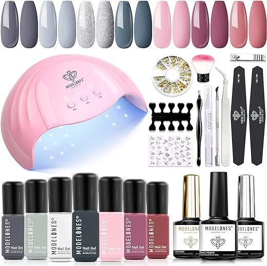 - 🌈COMPREHENSIVE GEL NAIL POLISH KIT: Included 7 lovely colors, 48W fast-drying light, 0.33oz Essential Nail Primer, Glossy Top Coat, Solid Base Coat (you can have both mirror and matte gel nail effect), a complete set of manicure tools. Let Modelones All-in-one gel polish set brings you a more pleasurable manicure experience.