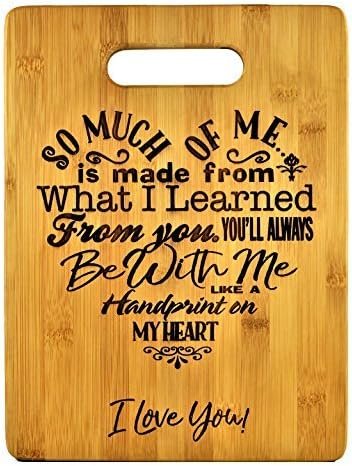 This specially designed Mom Words of Love Poem is engraved within a heart-shaped bamboo cutting board. It can be displayed as decor or used as a cutting board for culinary purposes. The engraved graphics express the sentiment “So much of me is made from what I learned from you, you’ll always be with me like a handprint on my heart ~ I Love You.” This is a perfect gift for moms, grandmas, or any special loved one. The durable bamboo board measures 8.75″ x 11.50″ x 5/8″ and is suitable for chopping vegetables, slicing fruits, or serving cheese and appetizers. Simple hand wash and maintenance instructions ensure its longevity. Make a cherished addition to any kitchen today!