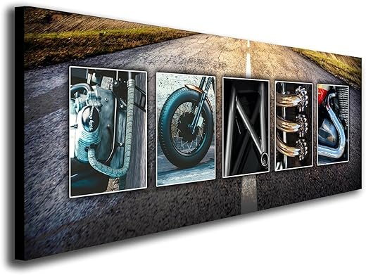 • PERSONALIZED: This stunning print features any name customized using hi-res photos of everything related to motorcycles, Harley Davidson, Indian, and other bike art. You can even select from many different backgrounds. Includes hi res photos of motorcycles, engines, and the open road.