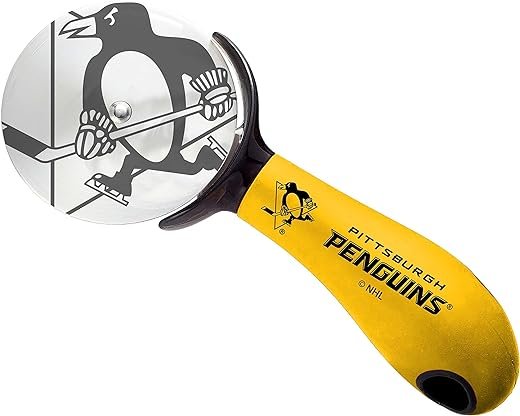 The pizza cutter is an essential kitchen tool made of durable stainless steel. Its sharp roller effortlessly cuts through all types of pizza crusts. With an ergonomic handle for comfort and control, it smoothly cuts across toppings of any size. The laser etched blade adds durability. This officially licensed cutter showcases team spirit and can be used for pies, cheese, cakes, and more. It makes a perfect gift for sports fans or pizza lovers during special occasions. Sport type: Hockey. Care instructions: Hand Wash.