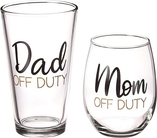 - LOL – Enjoy a relaxing evening with your new favorite stemless wine glass and pint glass, which reads “Mom Off Duty” and “Dad Off Duty”