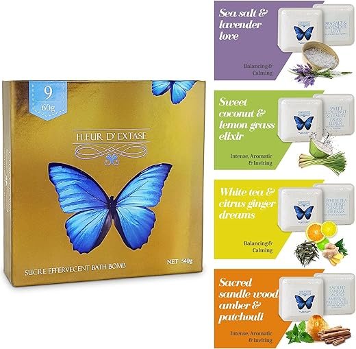 The Fleur D’ Extase Bathbombs are a set of 9 natural effervescent bath bombs. They are made with USDA Certified Organic essential oils, providing a luxurious and calming experience. Each bath bomb weighs 2 oz (60 grams) and comes in a beautiful golden gift box. These bath bomb sets make perfect gifts for various occasions and are a great addition to relaxing baths. They are vegan and free from toxic chemicals, ensuring a safe and enjoyable bathing experience. No artificial colors, parabens, ethyl alcohol, or phenoxyethanol are used, and they have not been tested on animals.