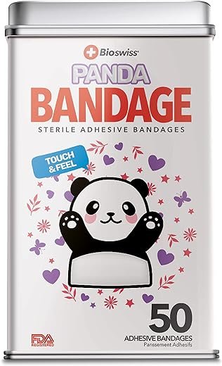 • PANDA CARTOON BANDAGES: This 50 piece tin of adorable panda bandages is great for putting a smile on kids’ faces while protecting wounds such as cuts, scrapes, and burns; sticky bandages are perfect for kids and adults alike, and also for school nurses and pediatric doctors
