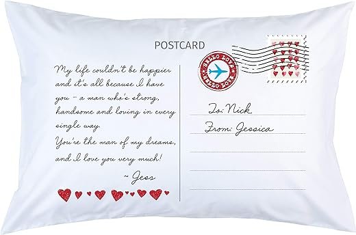 Give your loved one a personalized pillowcase shaped like a postcard, complete with a special message to greet them each night. This is the perfect gift for long-distance couples or for sending love to family and friends in a unique way. The standard size of 20″x30″ fits most pillows, and the 100% polyester material ensures durability. Machine washable and designed by BluBirdie in RI, USA. Make their sleep extra special with this delightful pillowcase.
