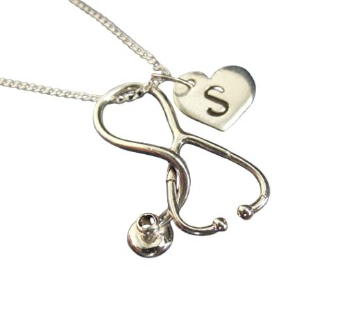 Sterling Silver personalized Stethoscope necklace with black zirconia stone & initial charm. gift to a doctor, medical student, or med school intern – the best choice is our wonderful stethoscope necklace made from sterling silver 925.