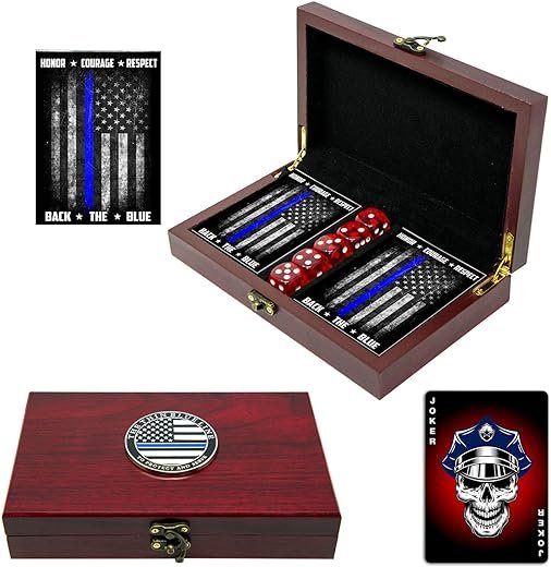Elevate your game night with our premium police playing card set. Featuring a beautiful wooden box adorned with a striking 3D Metal police emblem in support of The Thin Blue Line, it makes an ideal gift for both men and women. The card backs showcase the Thin Blue Line flag, along with the values of Honor, Courage & Respect, while the “Back the Blue” message adds a meaningful touch. Complete with 2 decks of professional police playing cards, 5 dice, and an awesome police skull joker card, this set is perfect for police enthusiasts or as a standout graduation gift.