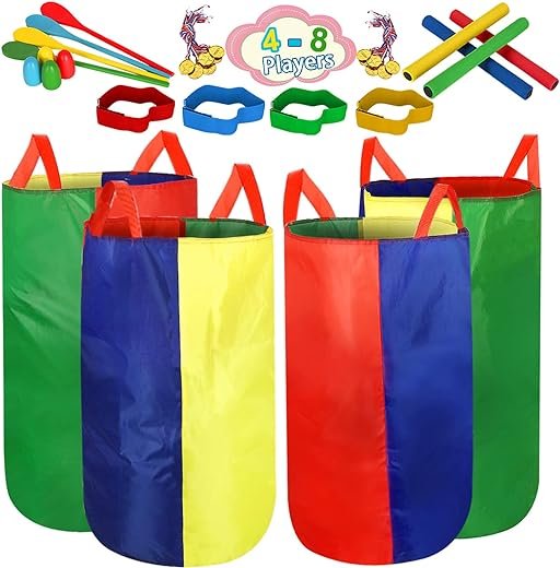 • Outdoor Games set 32 Pcs – Backyard games for adults and kids.4 Potato Sack Race Bags(Fit for adult and kids), 4 Egg and Spoon Race Games,4 Pcs 3-legged race bands, 4 colors Relay Batons for Running Race and 12 Game prizes (Reward kids who win the games).Suitable for 4-8 Players to Enjoy Endless Fun with Outdoor Lawn Games.