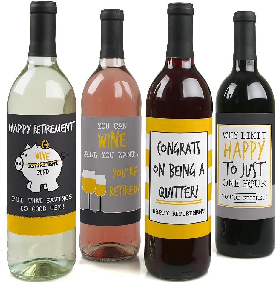 - UNIQUE RETIREMENT GIFT IDEA: Retired Wine Bottle Labels also make a great gift idea. Add Retirement Party Wine Bottle labels to a favorite bottle of wine or spirits for a special Retirement gift. Use each wine label on a favorite beverage bottle and gift individually or create an impressive Retirement gift basket using all 4 labels on coordinating wine or liquor bottles. Wine bottle labels will easily give your Retirement gift a personal touch!