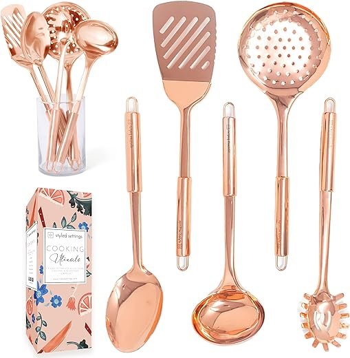 - ✔MAKE YOUR KITCHEN SHINE WITH THIS COMPLETE SET OF BEAUTIFUL STAINLESS STEEL COPPER UTENSILS – outfit your kitchen with this five piece set of stylish and sophisticated rose gold / copper kitchen utensils; includes serving spoon, pasta serving fork, slotted spatula / turner, kitchen skimmer and soup ladle; combine with our white cement utensil holder for an impeccable countertop look