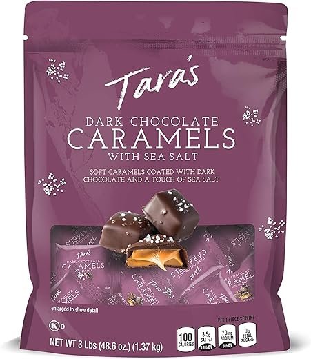 Introducing Taras gourmet caramels – the perfect combination of delicious and smooth caramel, covered in luxurious chocolate and topped with a hint of sea salt. Made with simple, premium, and natural ingredients like real butter and Madagascar vanilla, these caramels have a rich flavor that can only come from small batch crafting. Individually wrapped for freshness and convenience. Indulge in these dark chocolate covered caramels that stay true to grandma’s original recipe. Allergen Information: Dairy.