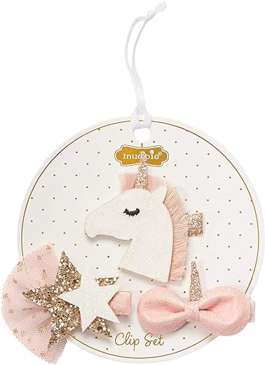 • 3-piece set. Glitter felt unicorn, star and bow alligator hair clips arrive on foiled display card.