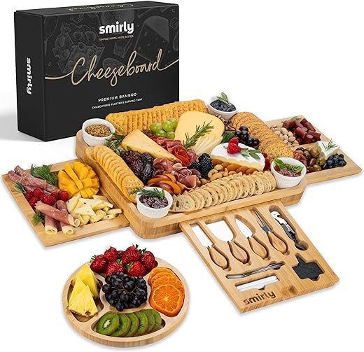 • ✅ Stylish Housewarming Gift – Our charcuterie board and knife set are the perfect gifts for any modern couple, new homeowner, or apartment dweller. SMIRLY’s unique and beautiful board, with so many beneficial features and accompanying accessories, comes with a sturdy decorative box for instant gifting. Everyone on your list, no matter the occasion, will love and appreciate this thoughtful, functional, and timeless gift.