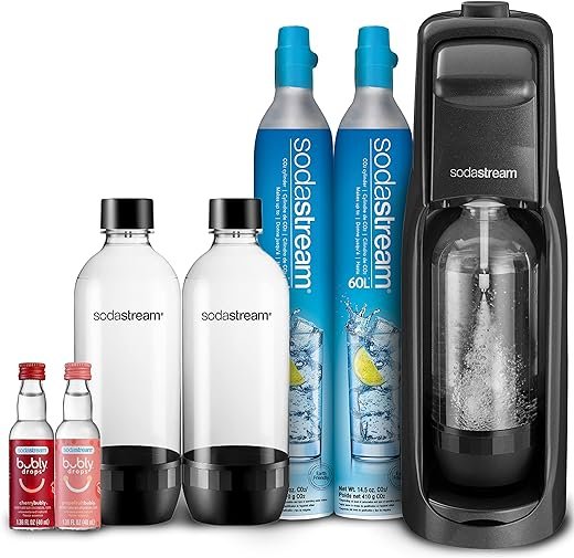 - Includes: Jet sparkling water maker, (2) 60L Co2 cylinders, (3) 1 liter carbonating bottles, and (2) bubly drops 40ml flavors