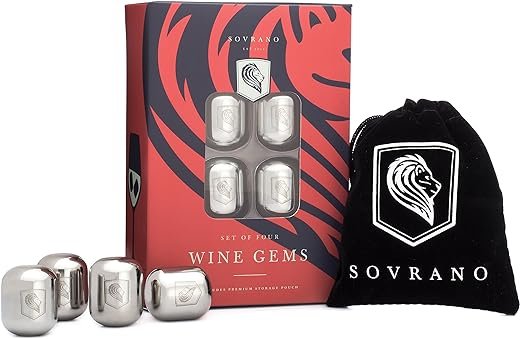 Sovrano’s Wine Gems are a stylish and functional alternative to traditional ice cubes for chilling your wine. Made from food-safe stainless steel, these reusable wine chillers will never stain or rust. Each package comes with four Gems, allowing you to customize your chill level. They can also be used for whiskey stones or as a chiller for other beverages. The Gems come in beautiful gift packaging and include a storage pouch. And with a lifetime warranty, you can order without risk.