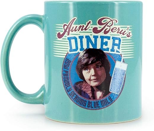 • RETRO DESIGN: Nothing says “good cup of coffee” like a stylish retro themed coffee mug. This Aunt Beru mug features a promotion for a fictitious, “Aunt Beru’s Diner” and how they now serve the infamous blue milk from Star Wars.
