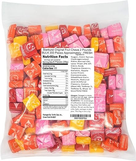 Starburst Originals Fruit Chews are a delicious treat packed with bold fruit flavors. This 2-pound bag is perfect for candy buffets, snacking on the go, or giving as a gift. These chewy candies can also be used in recipes or as decorations. With endless possibilities, they provide a burst of juicy flavor every day.