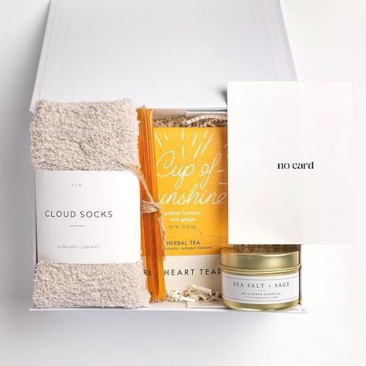 - Complete Self Care Gifts For Women – A thoughtful gift to soothe the soul! With organic herbal tea, wildflower honey, sea salt + sage candle, & fluffy cloud socks