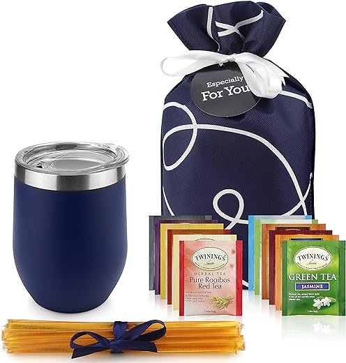 - Send a tea gift set to convey your warmest wishes with this perfectly presented TEA SAMPLER GIFT SET BOX. Unique tea gift basket for tea lovers includes a vacuum insulated stainless steel tea mug with lid and a tea sampler gift set of 12 different teas (black, green, white, organic, decaf and herbal) paired with all natural honey sticks. Every item is of the highest quality making this the best tea gifts for tea lovers women & men.