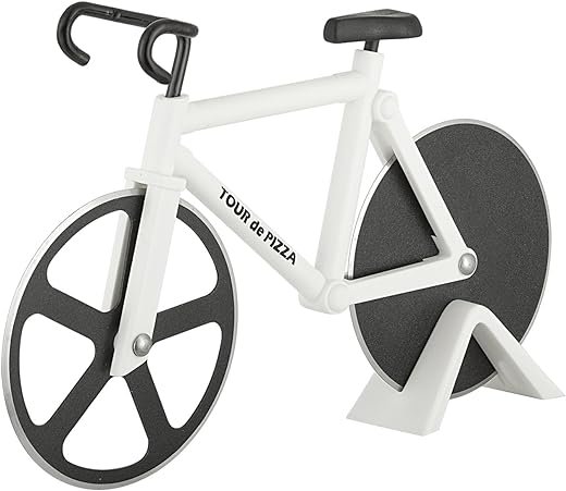 Inspired by the TOUR de FRANCE, the TOUR de PIZZA bicycle pizza slicer is the latest kitchen tool from SOHO Kitchen based in New York. This cool bicycle shaped pizza cutter features a dual blade design with 2 non-stick stainless blades for effortless cutting and simple cleaning. It is 1/10th scale of a real life fixie bike and is the perfect gift for bike enthusiasts, pizza lovers and anyone who wants a great talking point for the kitchen. It also includes a sturdy display stand for easy storage and display. The perfect gift for birthdays, Christmas, valentines, father’s day, mothers day, 4th of July or just a very fun and practical kitchen tool for yourself or the pizza lover in your life. It also makes a great valentines day gift for him or her and is a cute and fun gift for white elephant gift exchanges, secret Santa Christmas parties, fathers day gifts, mothers day gifts, birthday gifts or a fun gag gift for those that go to cycle studios. Also makes a fun Peloton accessory or Peloton gift for those that have the Peloton bike. The Tour de Pizza bicycle pizza cutter has also been featured as a tiktok trend items, amazon finds and buzzfeed.