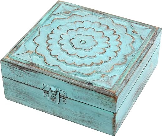- This wooden keepsake box features a beautiful floral design carved into the hinged lid and worn pale blue painted finish to give a vintage feel