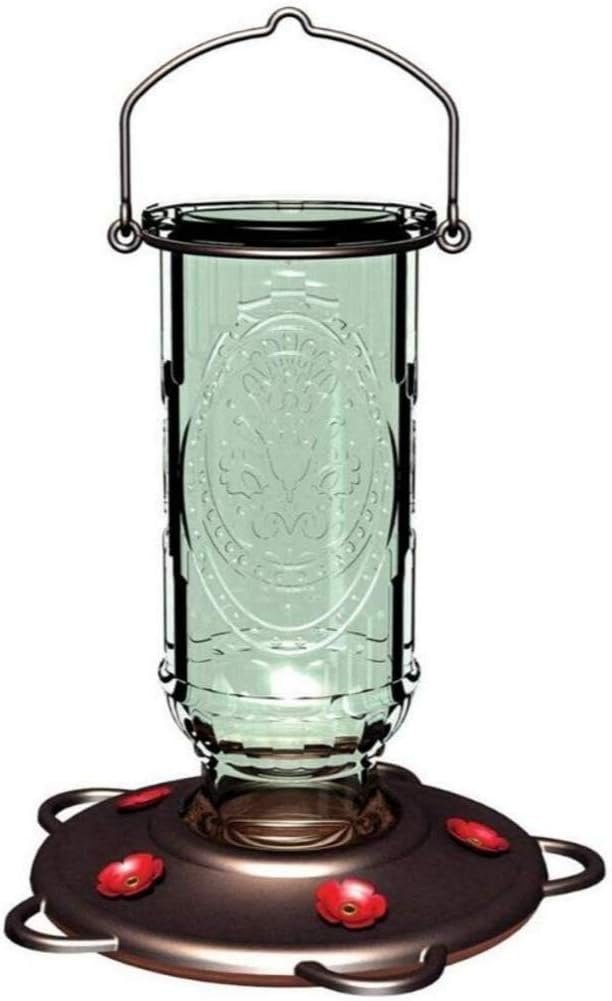 The Nectar Capacity hummingbird feeder is designed to hold 20 fluid ounces of hummingbird nectar, accommodating multiple hummingbirds with its five flower-shaped feeding ports. Its vintage bottle design adds an antique feel, while the burnt penny plastic base prolongs its lifespan. The red flower feeding ports are attractive to hummingbirds, and the feeder can be easily cleaned by hand with warm soapy water. This feeder brings beauty and functionality together, making it a must-have for any hummingbird lover.