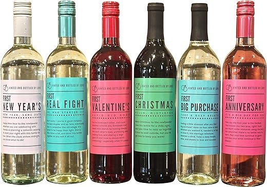 - CELEBRATE MARRIAGE MILESTONES – This set of 6 wine bottle labels serves as an adorable newlywed wedding present to perfectly commemorate 6 major events in a couple’s first year of marriage. Included: First Real Fight, First Big Purchase, First Valentine’s Day, First Christmas, First Anniversary, AND First New Year’s.