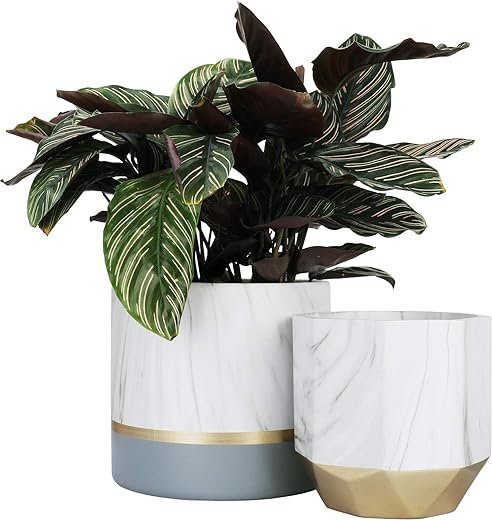 • DIFFERENT SIZES AND SHAPES – Each set comes two different pieces but partly utilizes the same marble ink pattern so it harmonizes just perfectly. The larger, cylindrical shaped planter is ideal for taller plants and the smaller, asymmetrical piece is designed for your smaller plants.