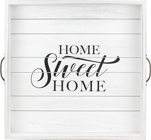 • Rustic tray features a worn white wood finish with Home Sweet Home printed in the base and 2 sturdy metal handles for easy carry