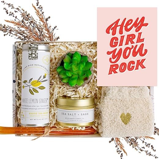 - The Complete Care Package For Women – Comfort gifts for anyone in need of a thoughtful gift box including fluffy white socks, sea salt + sage soy candle, wildflower honey stick, white lemon ginger tea, faux succulent, & a ‘Hey Girl You Rock’ greeting card