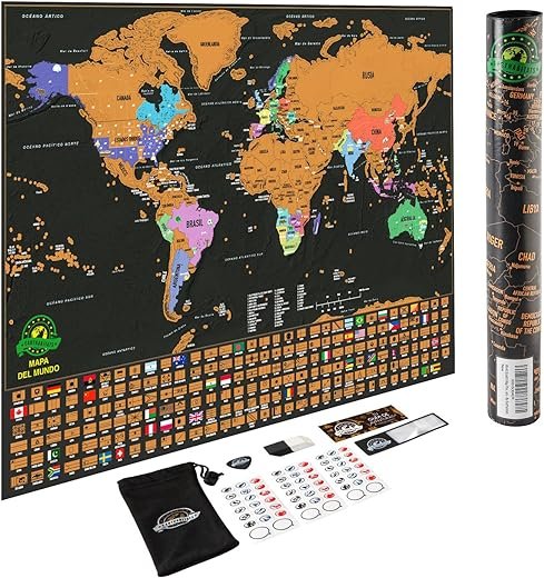 The World Scratch Off Map is the perfect gift for travelers! It features vibrant colors, accurate cartographic details, country flags, and landmarks. The map is printed on thick art paper and protected with laminated finishing, ensuring quality. It also includes US state lines for precise tracking, and comes with a complete set of accessories for a great scratching experience. Frame it with the Magnetic Hanger Frame for an impressive display. Plus, there’s a lifetime money back guarantee for your satisfaction.